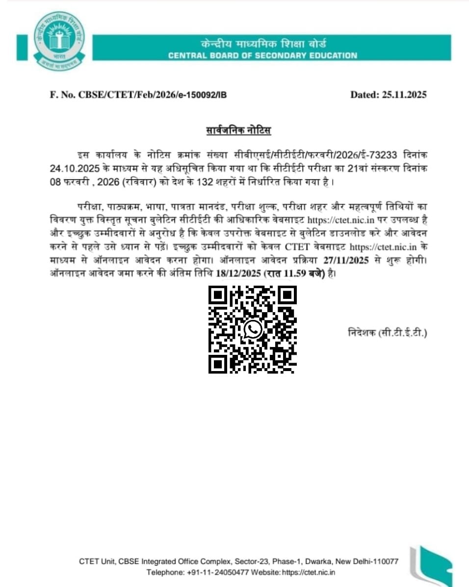 The CTET 2026 Notification has been officially released by the Central Board of Secondary Education (CBSE). This announcement confirms that the CTET exam will take place on 08 February 2026 (Sunday) in 132 cities across India. As a result, candidates now have enough time to prepare in a planned and systematic way.