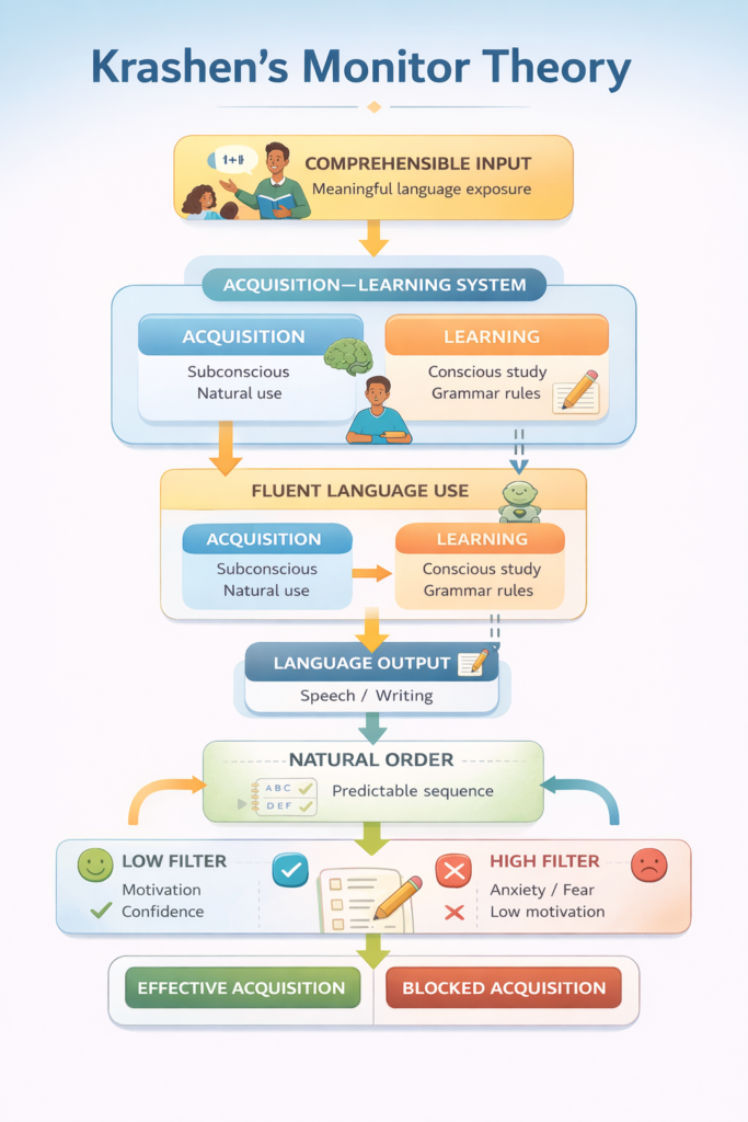Stephen Krashen’s Monitor Theory is one of the most influential theories in second language acquisition. It explains how learners acquire and learn a language and highlights the role of meaningful communication, input, and emotional factors in language learning. This theory has significant implications for English language teaching, especially in classroom pedagogy.